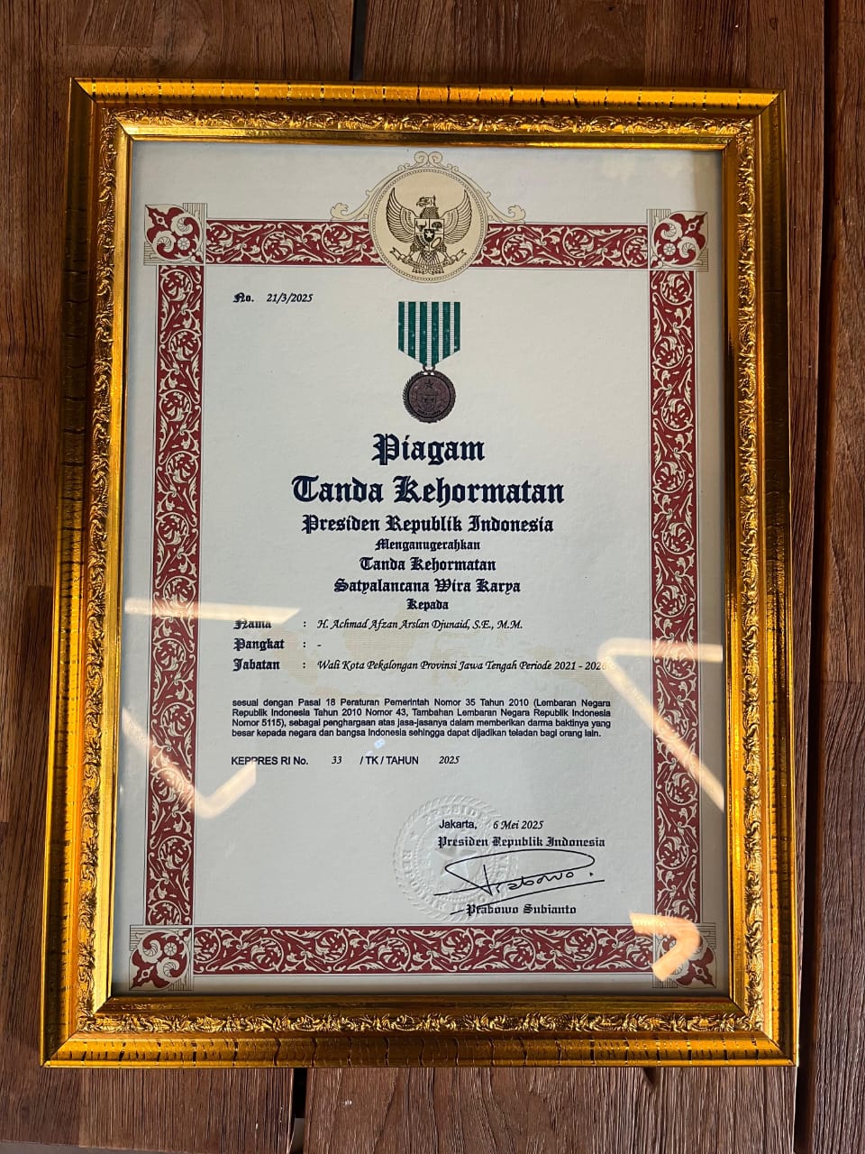 Bagian Organisasi Sekretariat Daerah Kota Pekalongan mengucapkan selamat dan sukses kepada Wali Kota Pekalongan, Bapak H. Achmad Afzan Arslan Djunaid, S.E., M.M. atas penganugerahan Tanda Jasa Satyalancana Wira Karya Pembangunan Bidang Kelautan dan Perikanan di Kementerian Dalam Negeri. Semoga senantiasa menjadi teladan kebaikan.